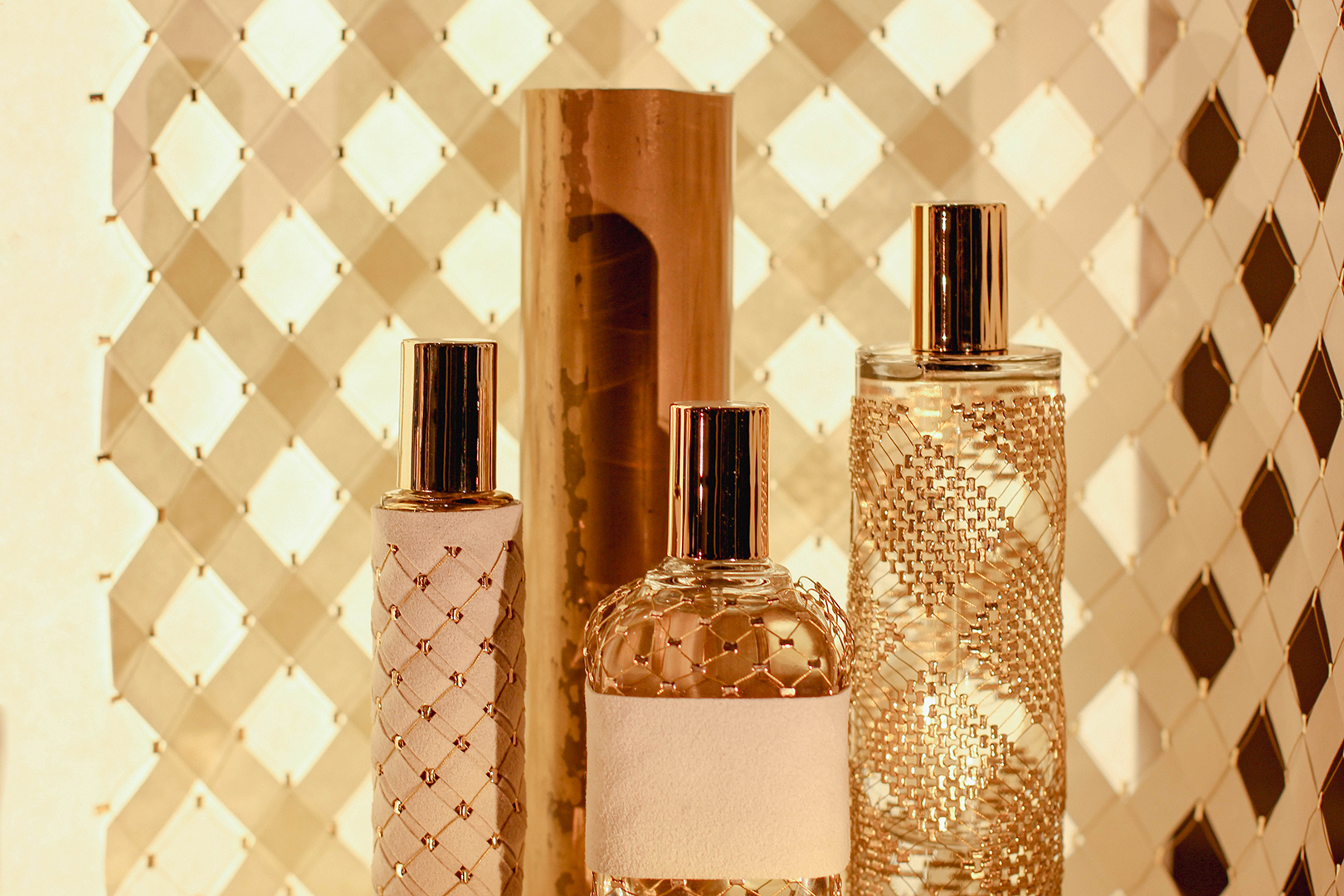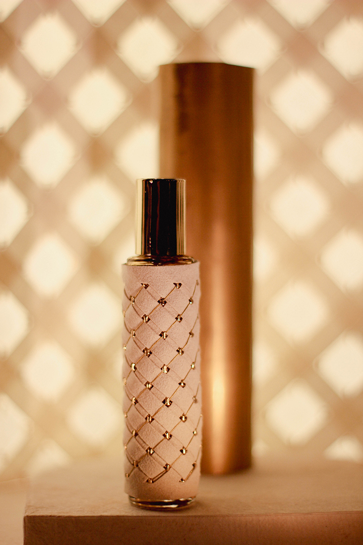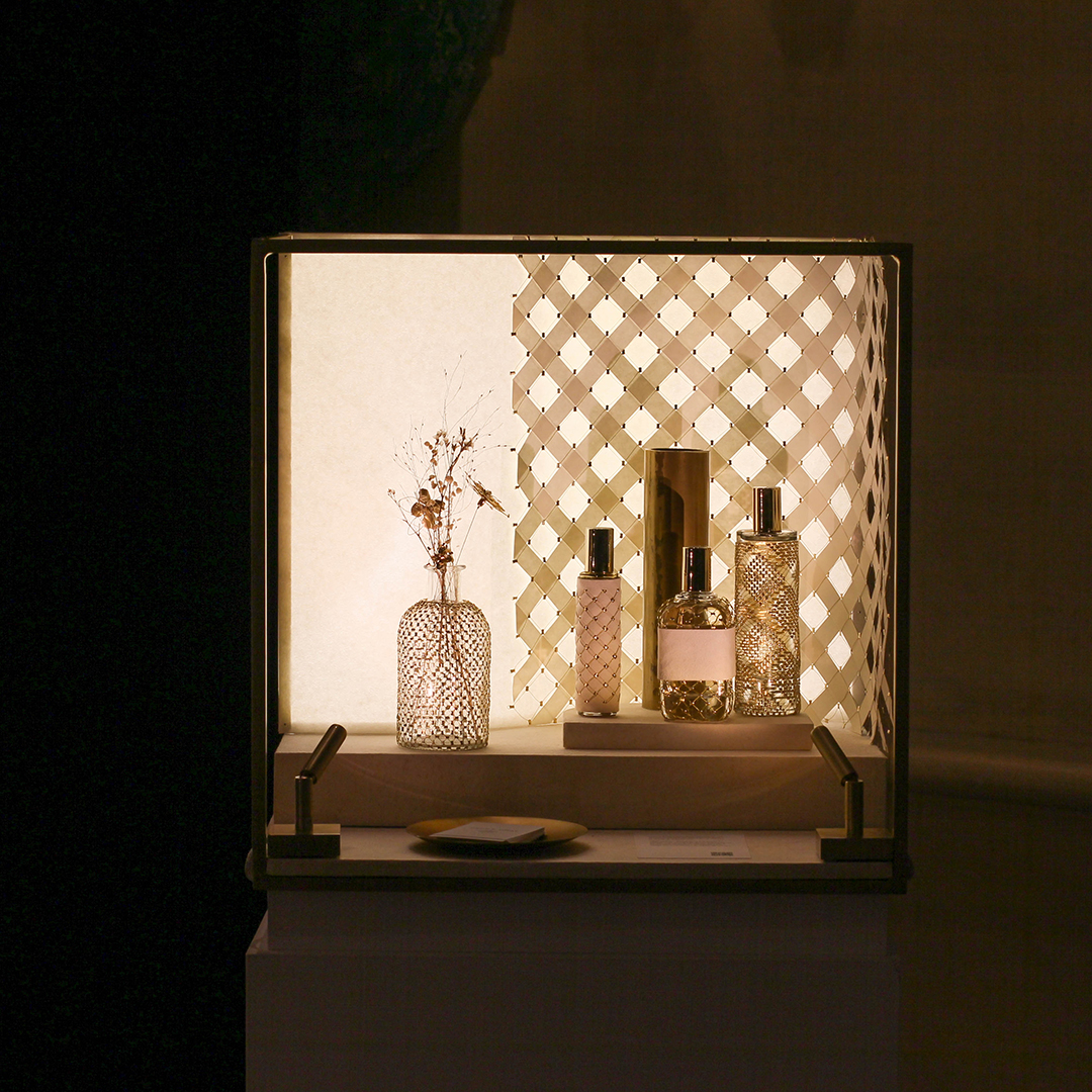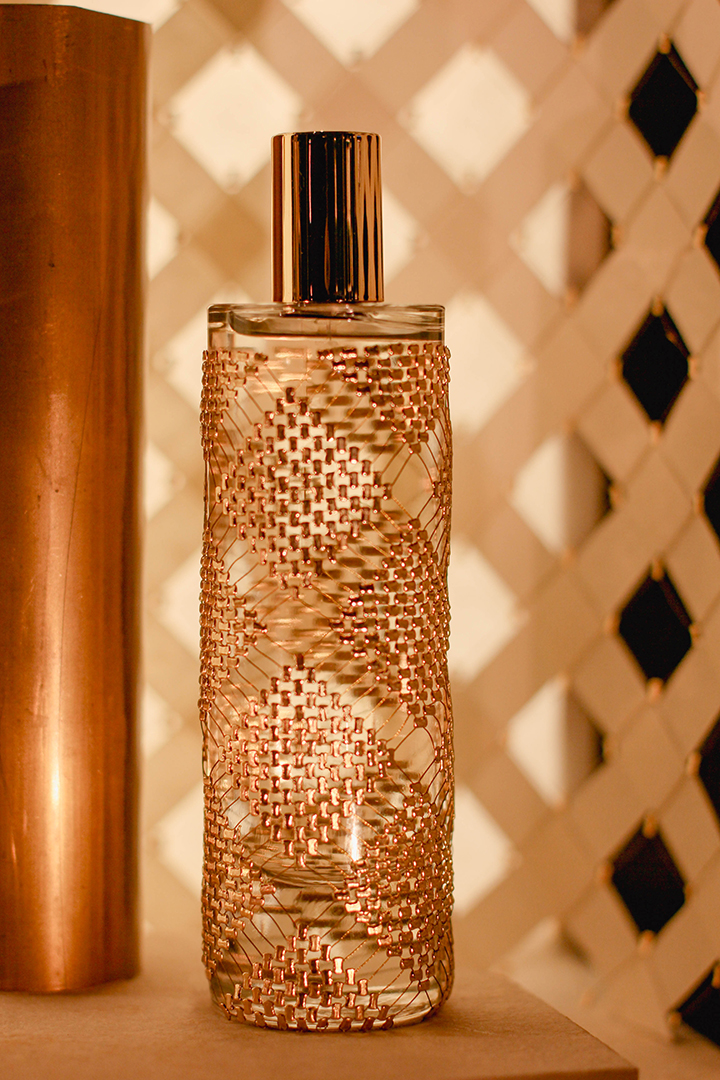 Pour sa deuxième participation au salon Les Places d’Or, Cécile Gray a dévoilé son expertise en maillage métallique à travers une scénographie pensée comme un écrin, une véritable mini-architecture. Alliant la délicatesse des fibres naturelles de papier et la finesse du fil d’or, cette mise en scène mettait en lumière quatre flacons habillés sur mesure de motifs géométriques. Un subtil jeu de transparence et de brillance révélait toute la richesse et la poésie de ces créations.