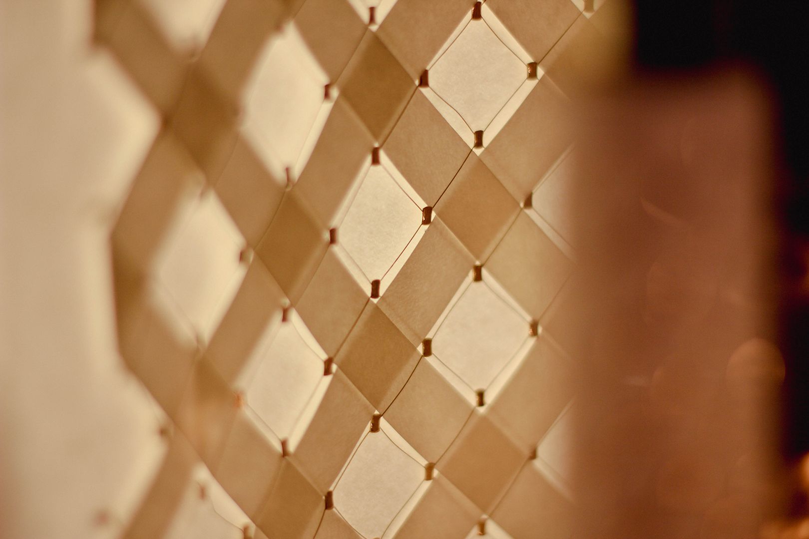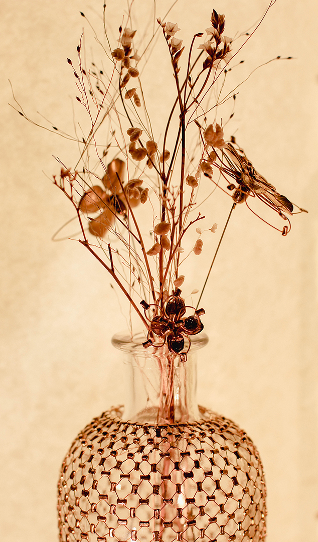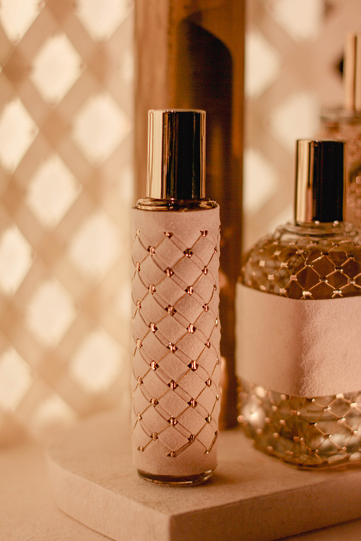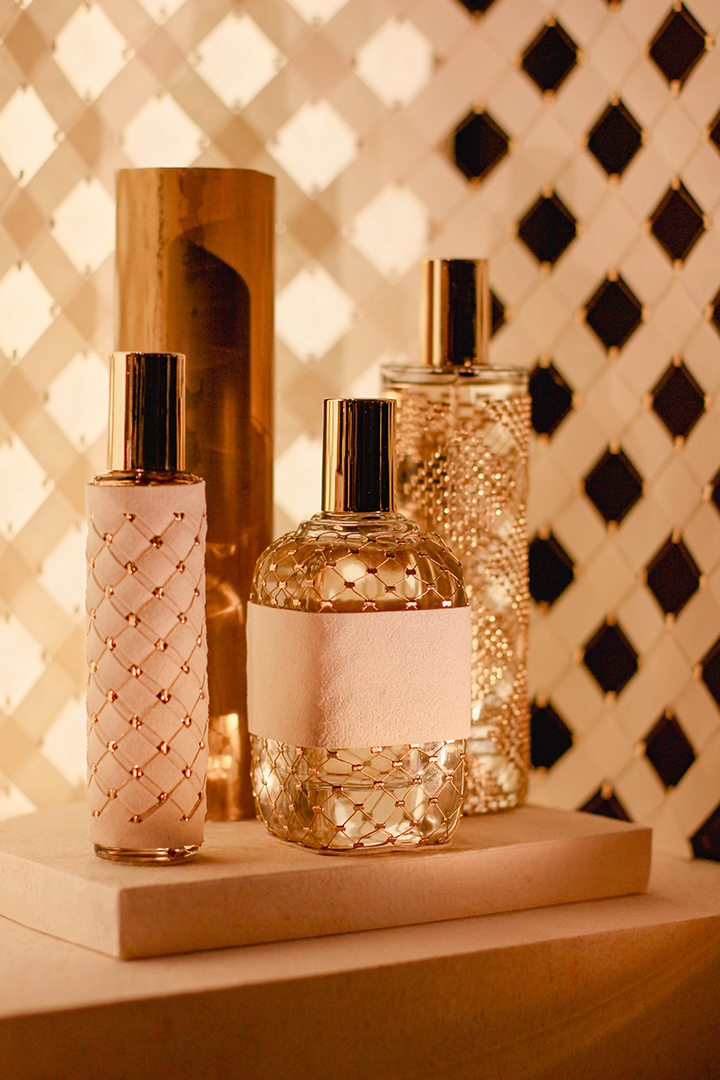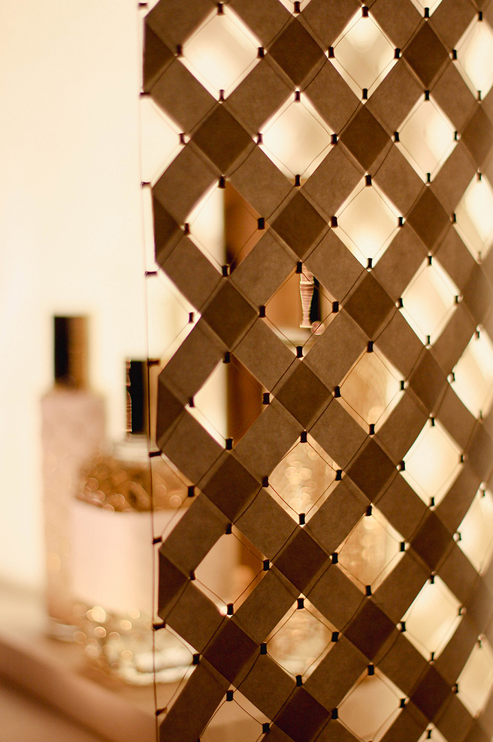 Pour sa deuxième participation au salon Les Places d’Or, Cécile Gray a dévoilé son expertise en maillage métallique à travers une scénographie pensée comme un écrin, une véritable mini-architecture. Alliant la délicatesse des fibres naturelles de papier et la finesse du fil d’or, cette mise en scène mettait en lumière quatre flacons habillés sur mesure de motifs géométriques. Un subtil jeu de transparence et de brillance révélait toute la richesse et la poésie de ces créations.