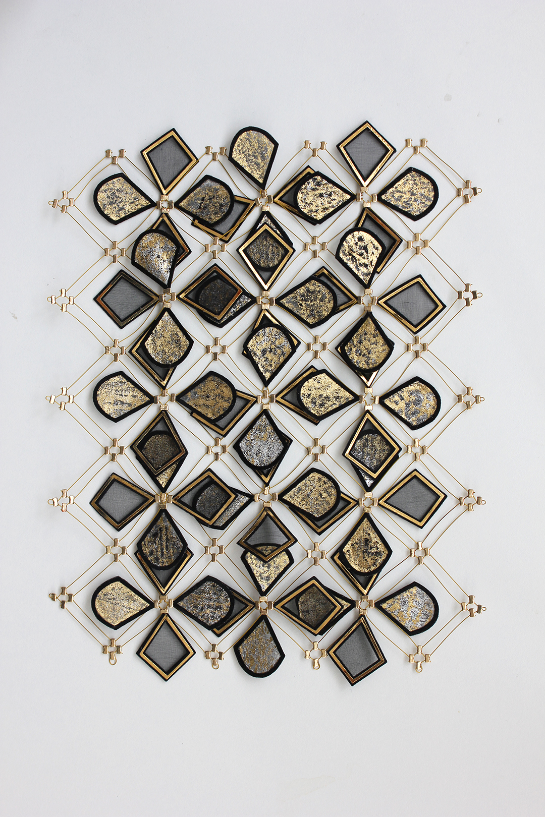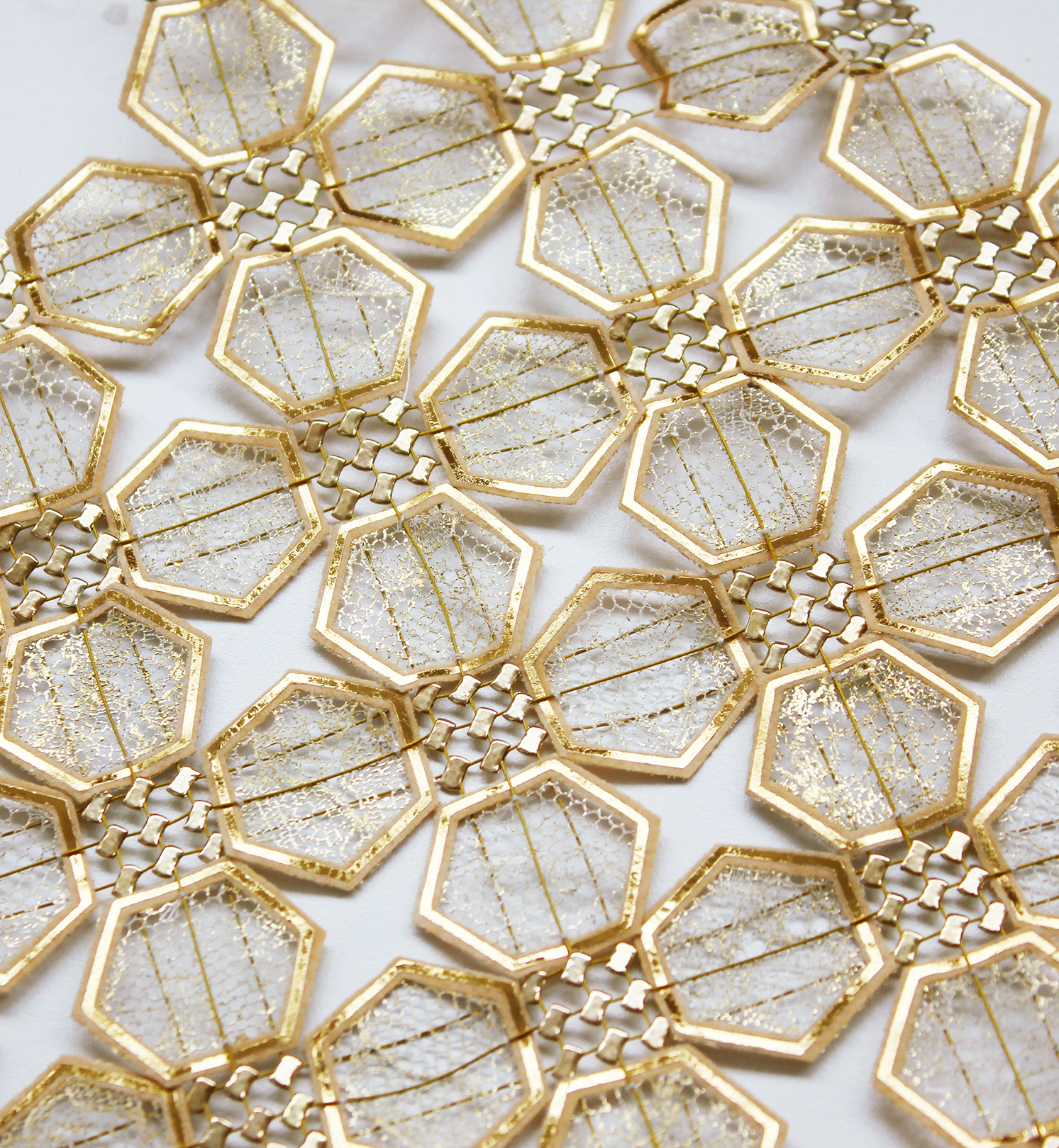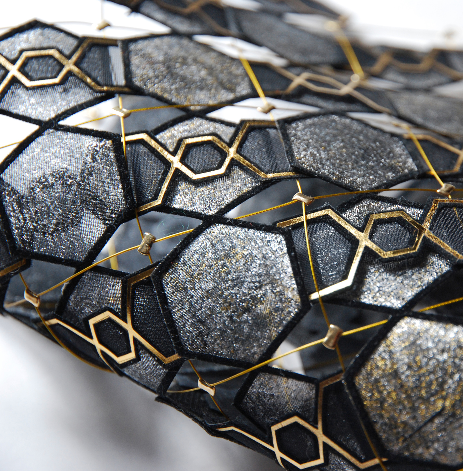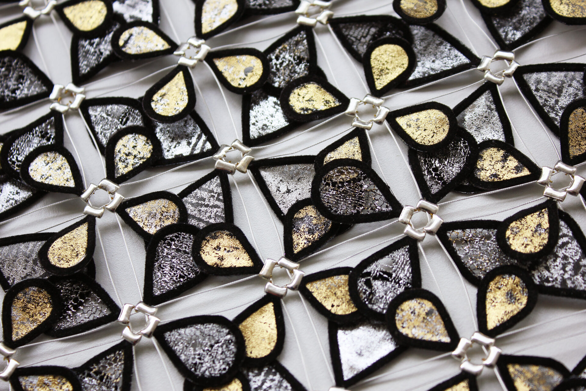 La géométrie en est le fil conducteur. Elle se déploie dans le travail précis de la grille métallique, dont la rigueur graphique se mêle à la délicatesse des pétales de soie et de dentelle, laminés dans de subtils dégradés d’or et d’argent. Entre architecture et textile, les formes trouvent un équilibre entre structure et légèreté.
