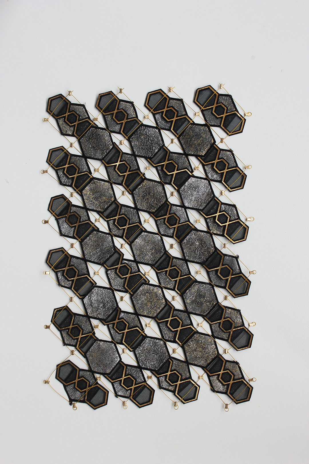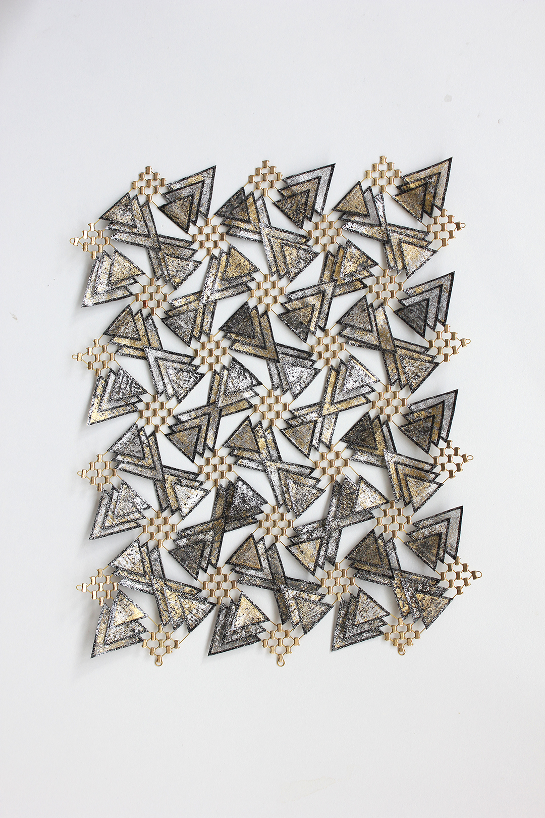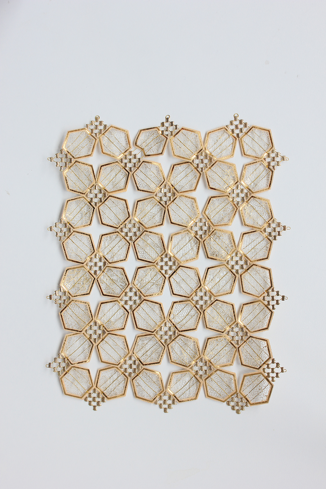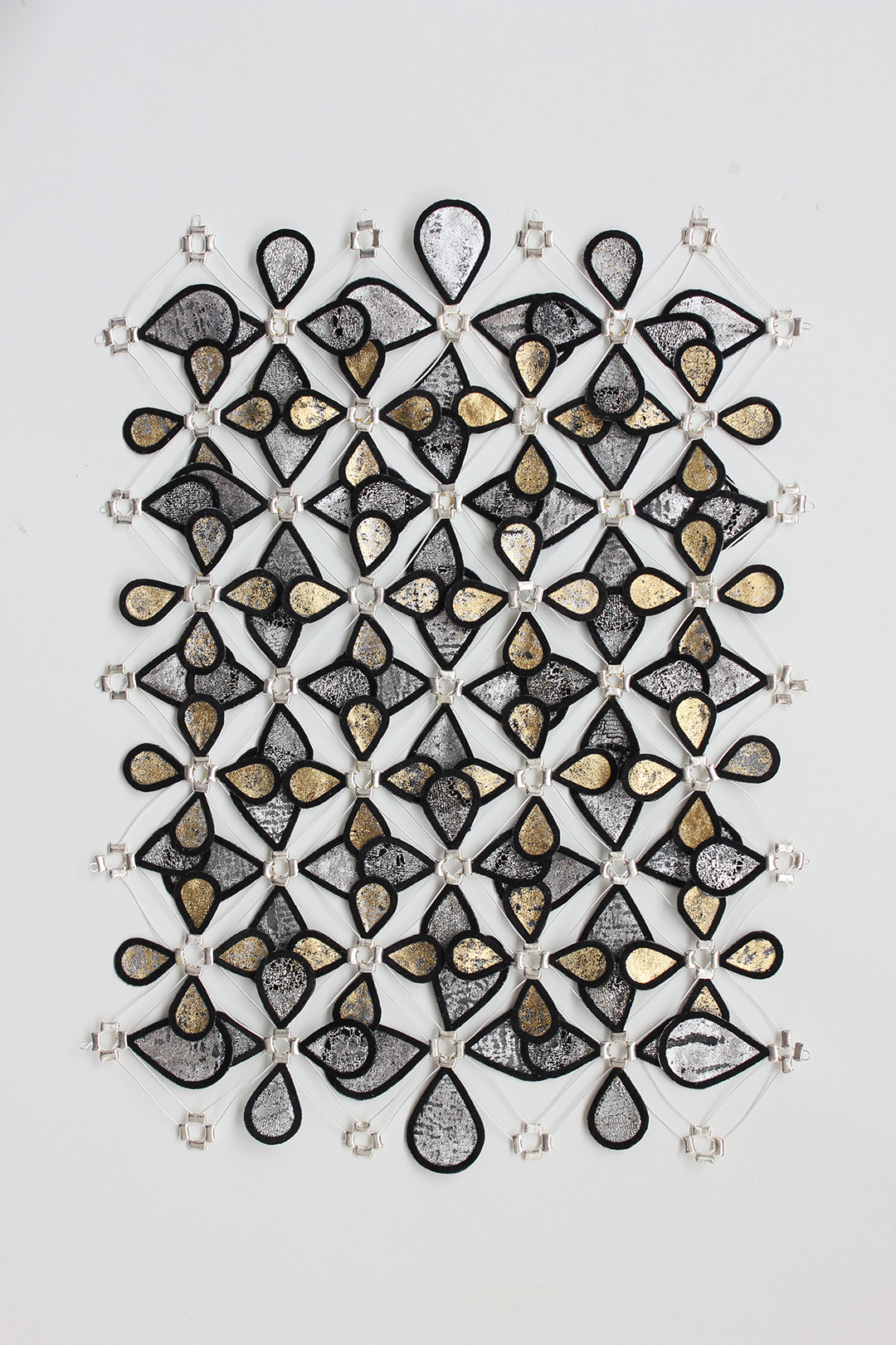 La géométrie en est le fil conducteur. Elle se déploie dans le travail précis de la grille métallique, dont la rigueur graphique se mêle à la délicatesse des pétales de soie et de dentelle, laminés dans de subtils dégradés d’or et d’argent. Entre architecture et textile, les formes trouvent un équilibre entre structure et légèreté.