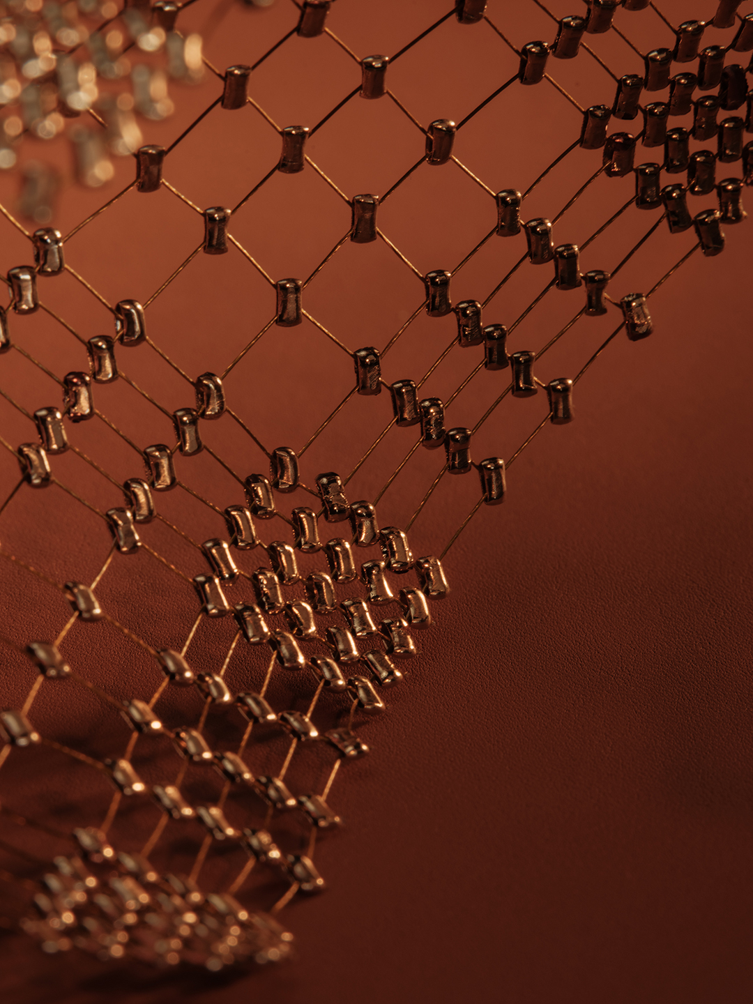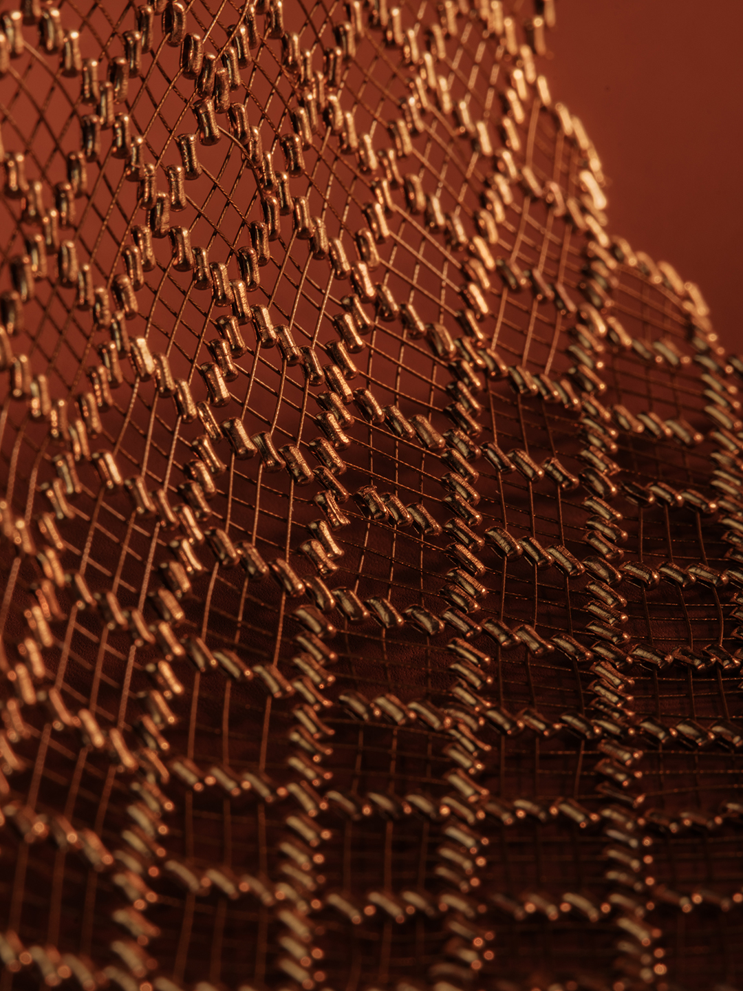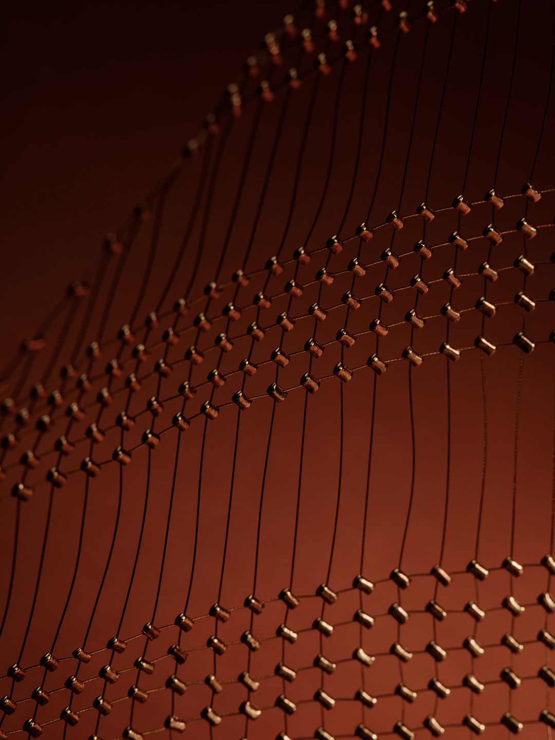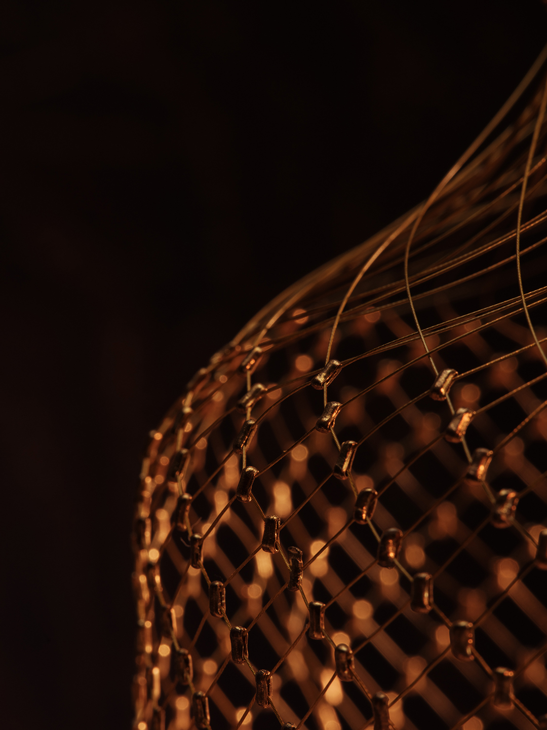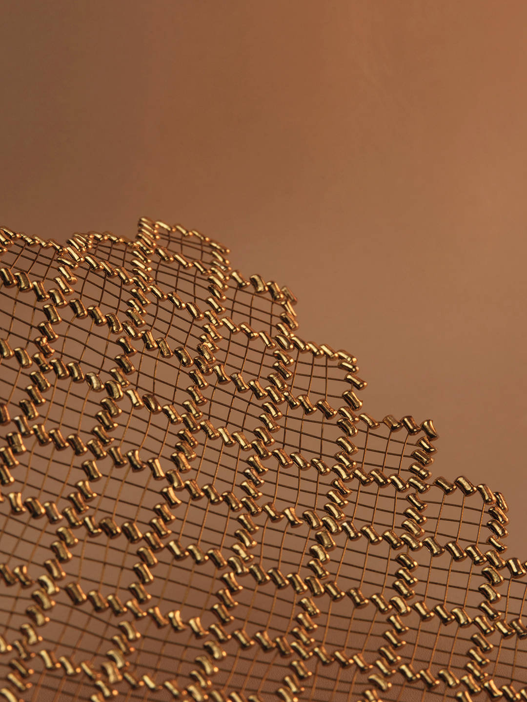 Chaque projet commence par une matière. Le studio développe en permanence de nouveaux échantillons créatifs, afin d’explorer les multiples possibilités offertes par la maille métallique : jeux de transparence, variations de textures, souplesse ou structure …